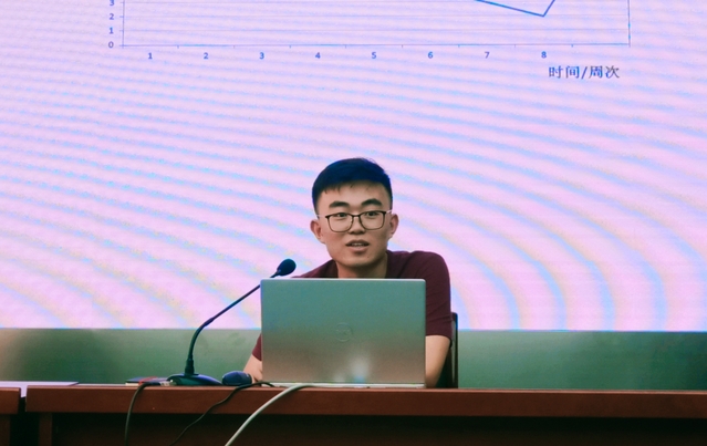 会议伊始,蒋名军同学分享了他在美国犹他大学的访学经历。作为直博生的他,大四上学期便代表学校与国外高校进行学术互动与交流。他主要就自己的学习生活、饮食习惯、业余生活以及热爱的篮球文化等方面进行详细介绍,并通过动画向大家解释了他所研究的纳米材料的具体原理。最后他对自己的国外访学生活进行了总结,并向大家提出了要学好英语和锻炼自立能力的小建议。