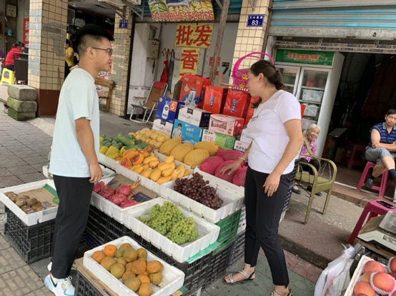 调研开始后,社会实践团的几位同学先整体探察了该水果市场,对目前上市水果的种类、数量及其新鲜程度进行了大致了解。随后,他们来到几家水果铺中了解一些更详细的情况。当前市场上销售的多为正处丰收季的瓜果类水果,其中以西瓜的数量居多。据店主们所讲,这是因为西瓜有清凉解暑的功效,销量较为可观。而且由于日渐炎热的天气对水果的储存非常不利,大多数水果铺并没有进购过多种类的水果。同时,一些店主表示售卖的瓜果多从当地的水果种植户中采购,并为社会实践团的成员们提供了部分水果的详细采购地址。这为团队下一步的调研提供了便利。