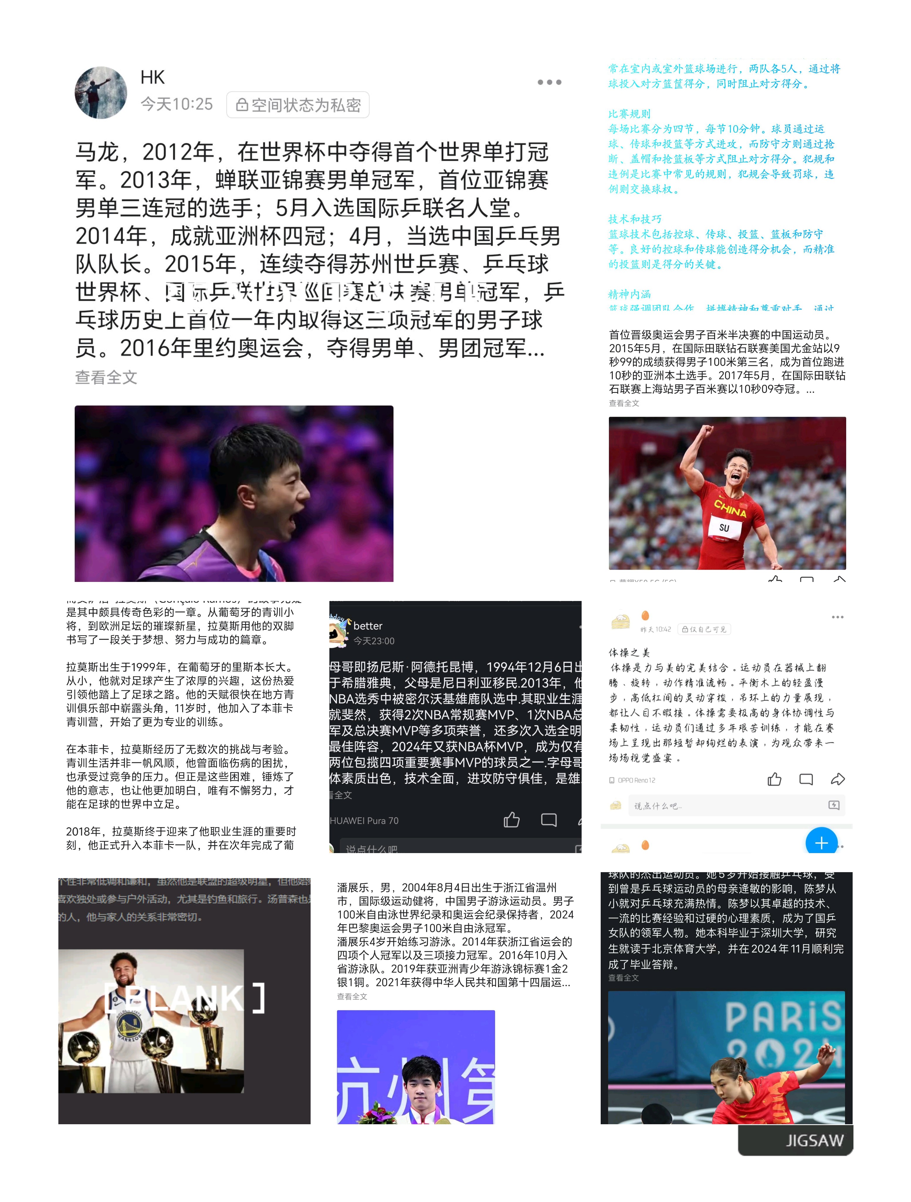 官方QQ平台广泛宣传,成功吸引了同学们的广泛关注。本次活动规则明确,要求参与者在打卡群中创立相册,并每日上传有关体育知识的文字截图。活动期间,同学们热情高涨,积极了解包括体育人物、体育运动、体育赛事在内的各类体育知识,并按时打卡自己的所学所悟。通过每天撰写与体育相关的文字,同学们逐渐拓宽了体育知识面,并且更加全面地了解体育领域的多样性和丰富性。