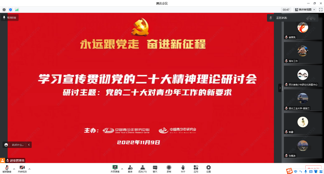 本次研讨会主题为“党的二十大对青少年工作的新要求”。会上,陆玉林、康晓强、张华、谭杰、万美容、陈蕴哲、张晓冰、马金祥八位专家就“发扬历史主动精神、增强青年对外工作使命担当”、“人的现代化:中国式现代化视域下的青年在场”、“牢牢把握青年工作是党的战略性工作的本质要求”等问题做了主旨发言。通过本次学习研讨会,各位同学纷纷表示在推进中国式现代化进程中要贡献自己的青春力量,不断增强重大成就的参与感、历史经验的获得感、面向未来的幸福感和民族复兴的使命感。