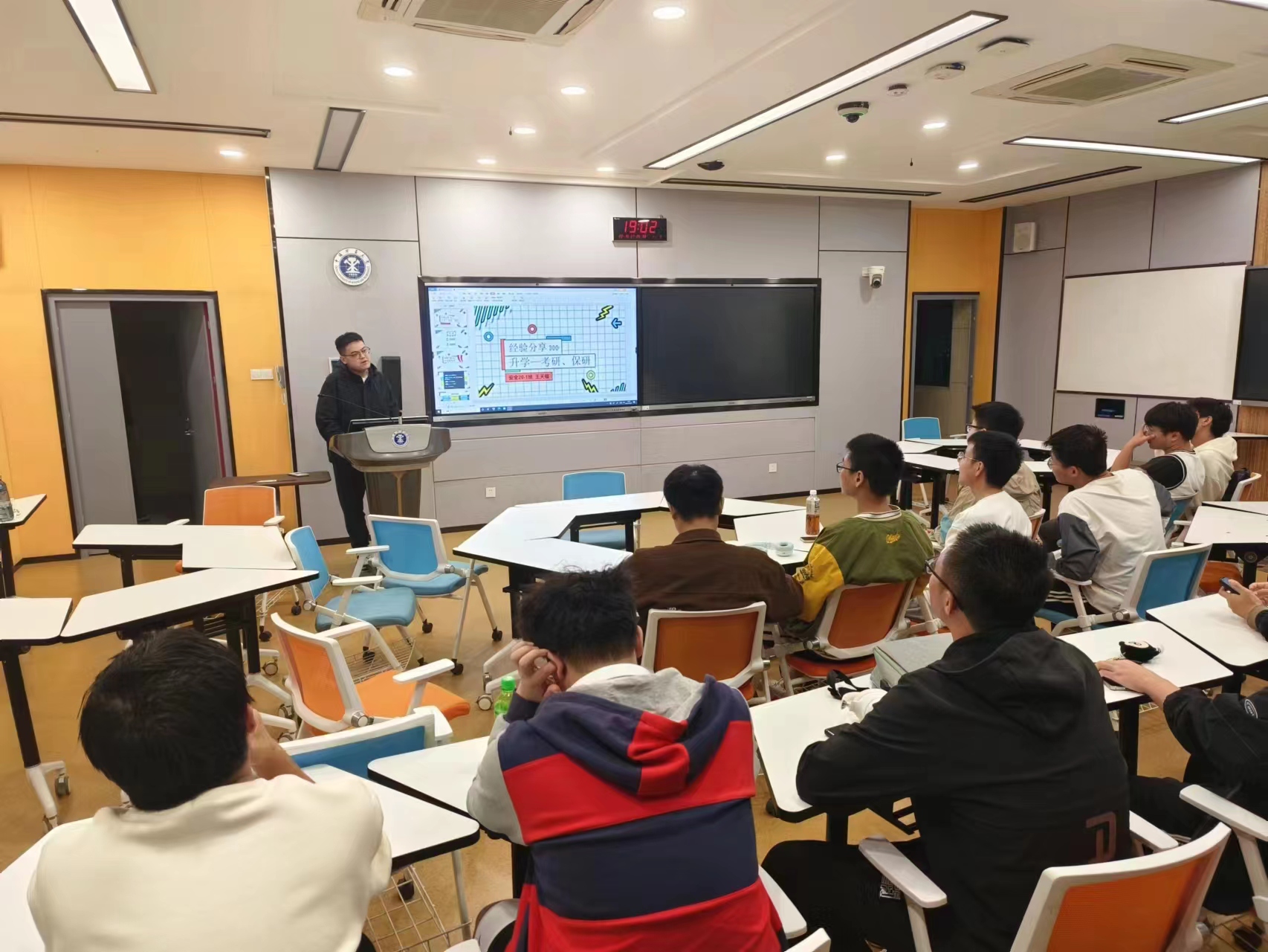 活动伊始,王天福统计了参会同学中有升学意愿的数量,了解同学们对于升学存在的疑惑和困扰。接着,王天福分别从考研、保研两个方面展开具体介绍。在考研方面,王天福从身边成功考研上岸同学的事例引入,告诫同学们要时刻关注考研信息的变化,提前了解目前院校的招生数量、考试科目、复试近三年分数线等,避免因信息误差导致院校选择不当,劝勉同学们及时找准努力的目标,努力学好接下来的专业课,为后续考试做好准备。接着,王天福介绍了推免研究生的具体要求、推免类型,导师选择和自己选择留在本校直博的心路历程。在讲述保研的具体流程时,他强调了学习成绩、语言表达、专业知识、科创能力的重要性,鼓励同学们提前了解a片无码