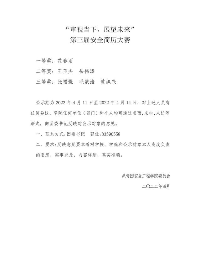 的全体同学。同学们通过线上报名的方式参与比赛,并提交比赛简历。简历内容需包括姓名、性别、年龄、联系方式等基本个人信息,以及个人的教育经历,自我评价,求职意向,工作经验等方面的内容。最后,评委将根据简历制作是否完善和精良,简历的内容安排是否得当等要求来进行打分。本次活动进行时,参赛同学重视程度高,认真准备简历内容,审视自己能力上的优点与缺陷,把习总书记寄语——广大青年,要志存高远,脚踏实地,坚持从实际出发,在合适的岗位上发光发热牢记心中,本次参赛的简历质量高,数量多,完成度好,举办顺利。