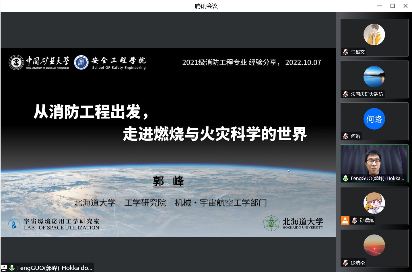 本科和硕士阶段的求学经历、在北海道大学博士阶段进入燃烧科学的研究方向以及工作后在燃烧科学领域的研究课题,分析了博士后与本科硕士阶段的区别与联系,对同学们提出了四点建议:要学好本科阶段的基础课程,培养自己的兴趣爱好,结交志同道合的朋友,探索自己感兴趣的行业和领域。接着,郭博士解答了同学们提出的问题,提醒同学们要重视基础学科的学习,鼓励同学们要勇于尝试,摸索自己的兴趣方向,跳出舒适圈挑战自己,“每一次挑战一点点,生活就会有不一样的变化”。随后,朱国庆教授重点讲解了大一、大二阶段理论学习对未来发展和研究的重要性,“本科的基础课和专业课学好,科研的底气更足,未来天花板更高,同学们要珍惜当下,不虚度光阴,不要让新冠疫情影响大家的学习和科研”,同时鼓励同学们建立起学科自信和社会责任感,“城市火灾形势严峻,火的研究有迫切需求,需要大家认真琢磨和研究,希望大家不要脱离消防行业,消防需要大家共同攻坚克难”。最后,班主任何路老师勉励同学们要约束自己的行为、管理自己的时间、明确未来的道路,把握机会,为消防事业的发展做出贡献。