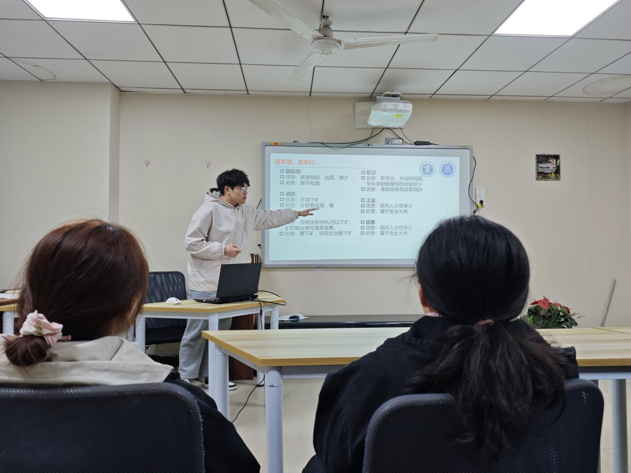 的不同专业引入,分别介绍了安全工程、消防工程、职业卫生、应急技术与管理等专业,并对安全大类中的国际班、矿山安全、工业安全等不同方向做了分析。随后王坤用自身在消防的经历为我们详细介绍了消防专业的培养计划和就业升学问题,消除了同学们对不同专业间的疑虑,并为同学们的下一步发展提出切合实际的规划。