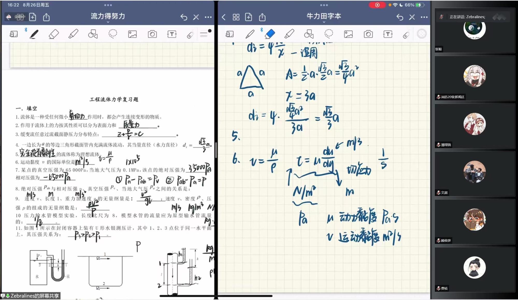 8月26日下午4时,流体力学复习准时开始,2020级全体本科生参加线上“学霸课堂”活动,主讲人曹蕾为了使同学们看得更直观,她将复习题册共享到屏幕上,写出每一题的解题过程,详细地讲解和耐心地答疑让同学们将知识点记得更加牢固。
