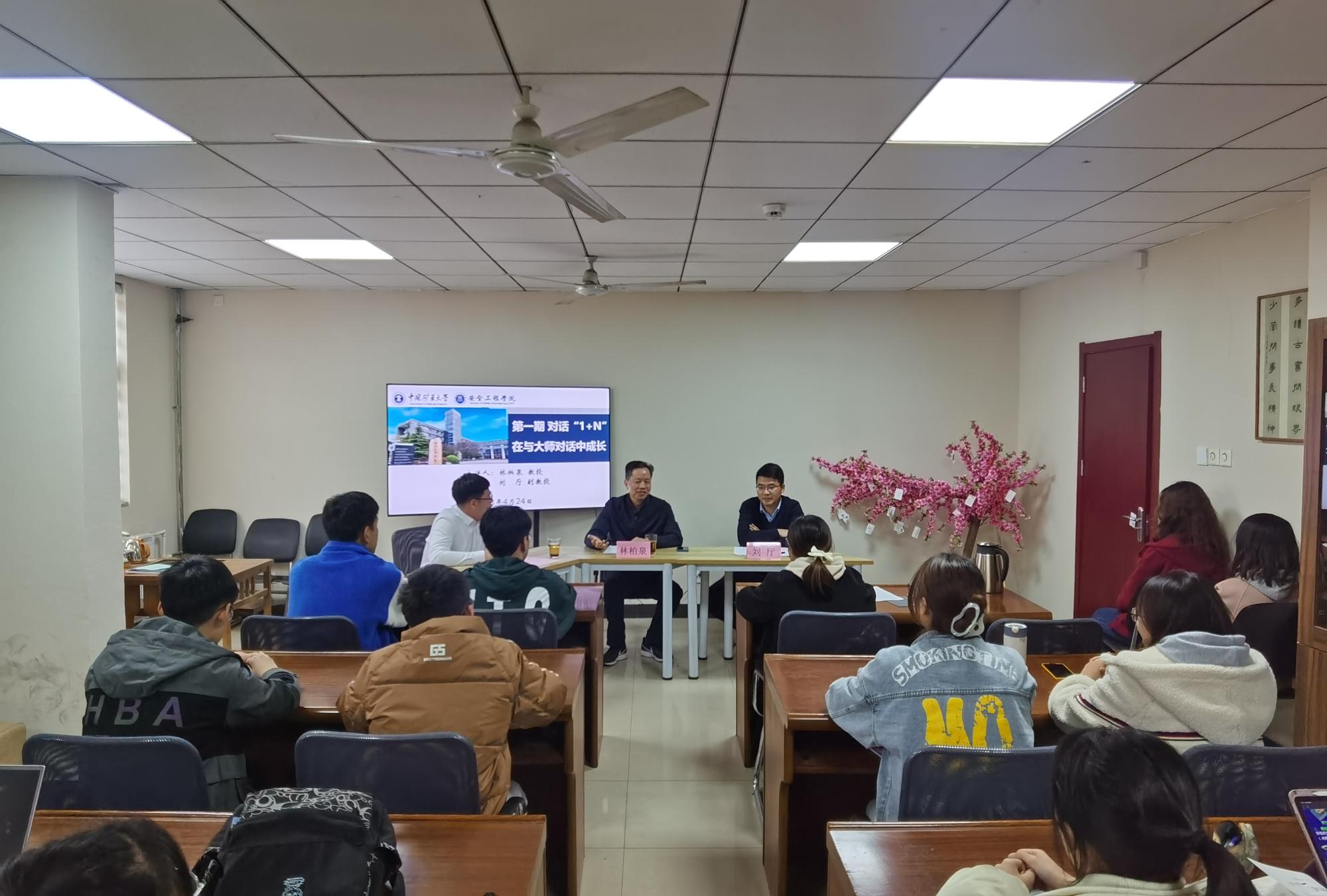 校选择、国内外求学分析等几个方面依次展开。林柏泉教授和刘厅副教授结合自身的发展经历,针对上述访谈问题展开详细阐述。访谈中,林柏泉教授讲述自己年少读书时,便立志于中国矿业的安全发展,并以此勤奋学业、坚持锻炼,坚毅铸就科研成果。林教授主张有教无类,提出在培养学生过程中更加注重激发学生自身的发展潜能,引领其主动投身科研。林教授强调“五个一”工程,鼓励当代大学生应注重课程学习和管理工作的综合提升,努力成长为新时代复合型综合人才。刘厅老师简述自己转专业的经历和心路历程,针对学生时代科研问题对不同年级的学生提出了相应的建议。刘厅老师结合国外交流的经历,客观分析了国内外科研环境的对比变化,殷切希望同学们学有所成,回馈祖国,怀爱国心,扬爱国情。