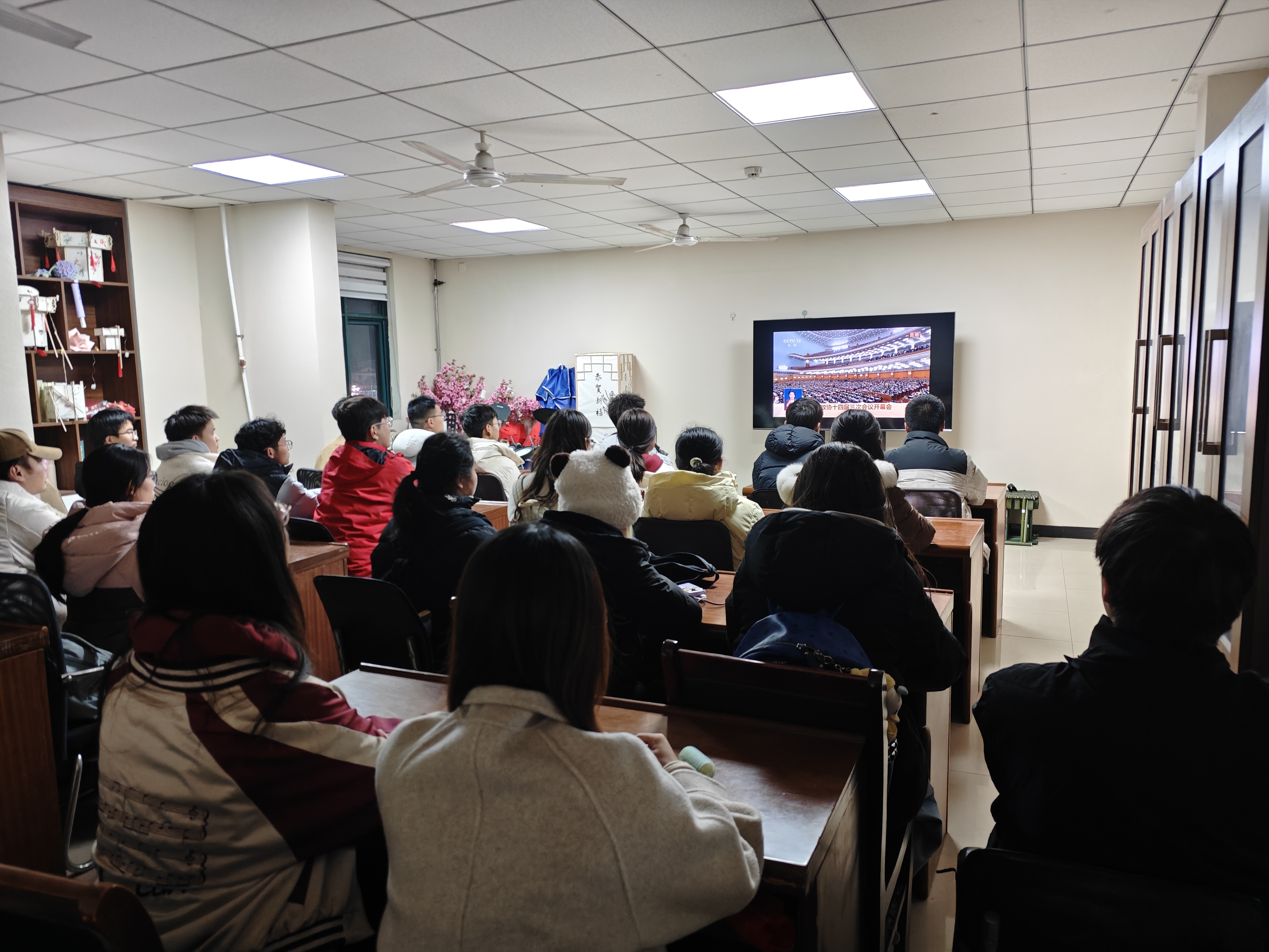 于3月5日在行健书院组织学生集中观看全国两会开幕式,并围绕两会内容与精神开展专题学习交流活动。