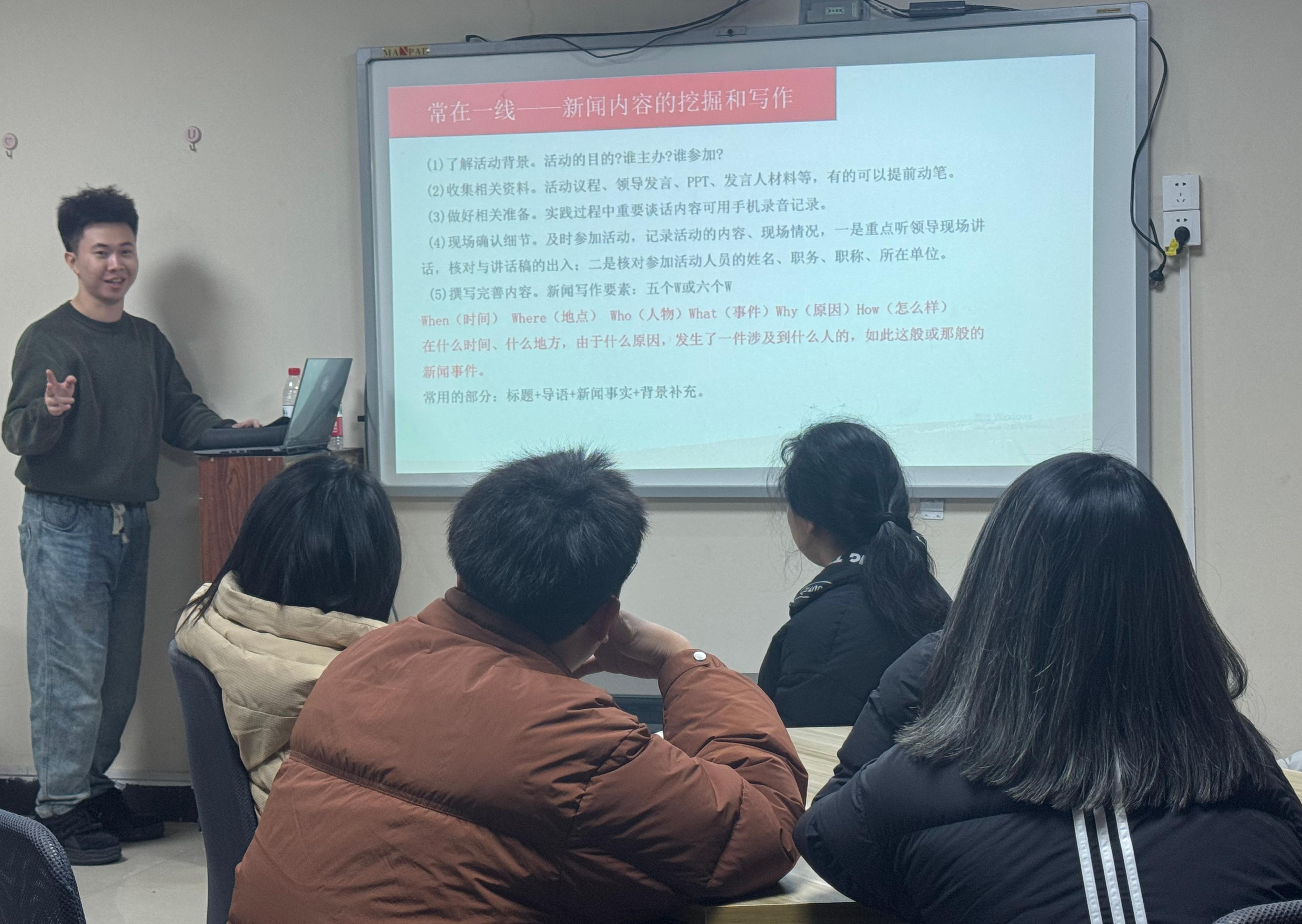 宣传的一些基本要求,特别强调了新闻写作的基本要素和对文稿内容的要求。接着,杨卓达同学利用新闻宣传配图和相关新闻宣传稿件作为案例,向在场的同学详细介绍写新闻宣传中的重点和难点。同时,杨卓达同学对新闻宣传的照片素材进行讲解,当并场示范如何拍出一张符合情景的宣传照片。活动尾声,在场同学们对新闻宣传工作中存在的困惑与主讲人进行互动。