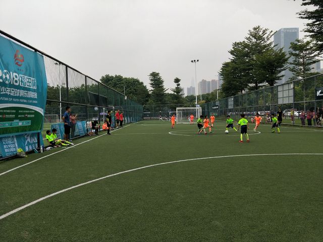 在公园的中心,青少年足球俱乐部联赛福田杯正在激烈地进行着。一群10后的球员们奋力拼搏,球场上充满了青春的气息,这种比赛全民化的现象体现了改革开放以来,人们更加注重对健康体魄以及对体育精神的培养。