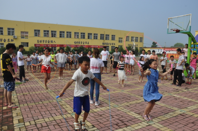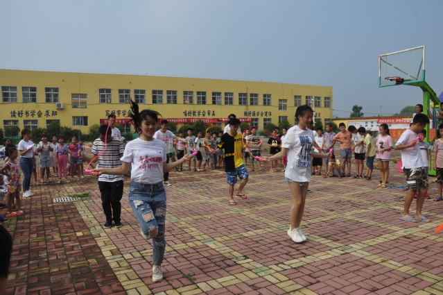 “仲夏希望”支教团在如期举办的趣味运动会中开展第一项比赛项目——跳绳。