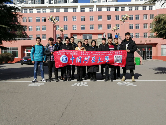 上午十点,团队所有人员集合完毕。在活动开始前,同学们首先拜访了恩师,向老师汇报了同学们在大学里的情况,同时向老师们送上节日的祝福。此次宣讲活动分三个阶段依次进行,首先团队成员深入班级内,向高二年级两奥赛班进行PPT宣讲,现场互动交流,向他们详细描述矿大充实而美好的生活。随后,团队在征得校方允许的条件下,在学校的每个教学楼下张贴矿大的宣传海报,让每一位同学认识矿大。同时,对未能进入班级内部宣传的班级进行了矿大宣传册的发放工作,以让更多的同学能够了解到同学们矿大巍巍学府。中午十一点半,同学们进入学校的大礼堂为高三年级的尖子生进行最后的宣讲。宣讲以PPT为主分,分六部分对矿大的基本情况、学术资源、人才培养方式、奖励体系、校园文化与徐州风土人情进行详尽的介绍,宣讲的过程中,同学们热情高涨,台下不时发出阵阵掌声,同学们还进行了现场互动答疑环节,并向学弟学妹们分享自己的学习方法和学习经验,也给同学们留下了联系方式,鼓励同学们奋发图强,决胜高考,实现个人价值。活动最后,同学们向同学们袒露“风里雨里,同学们在矿大等你”的共同心声。
