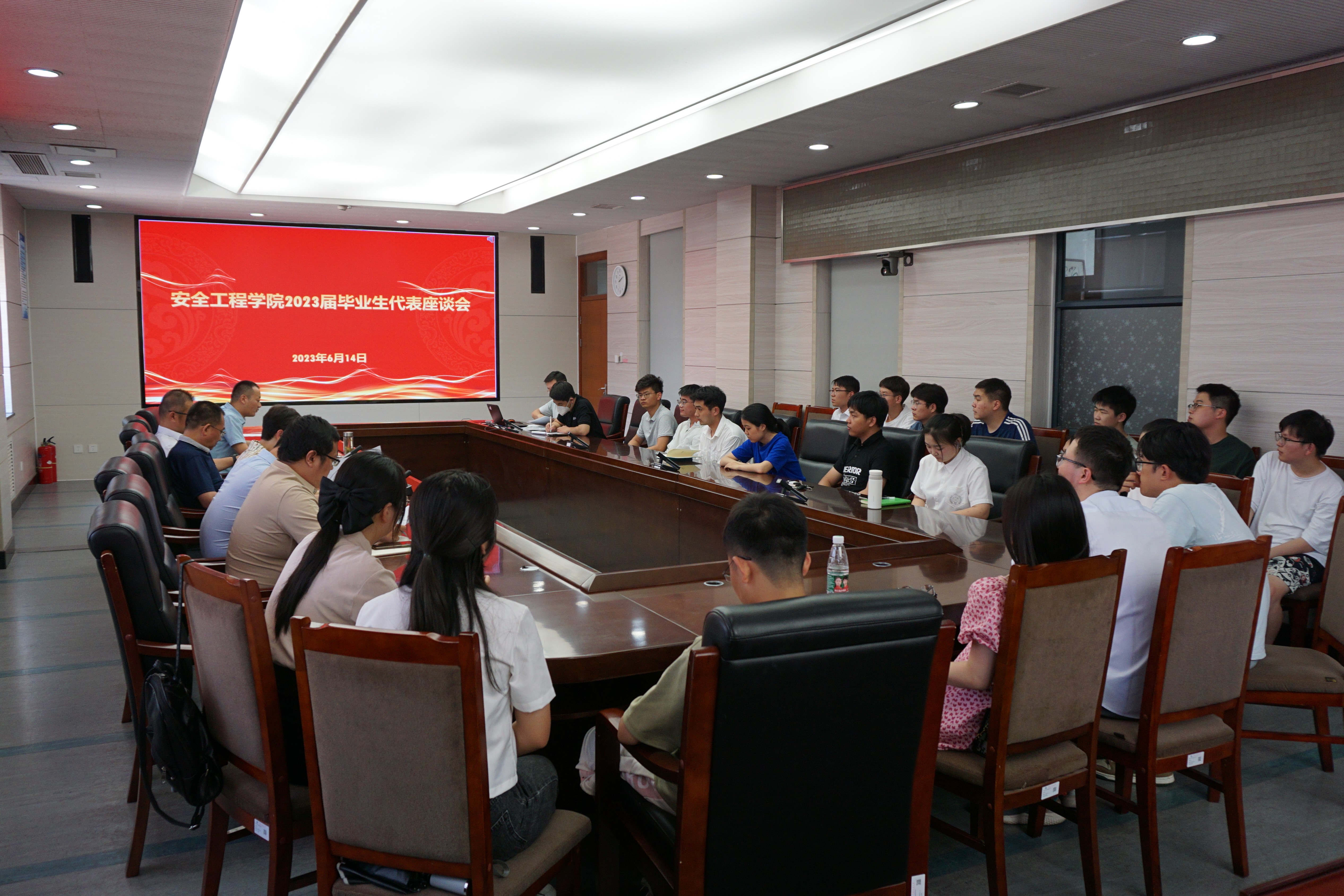 在矿业科学中心A412举行2023届毕业生代表座谈会。院长王恩元,院党委书记曲颂,副院长郭梅香、刘晓斐,相关科室负责人及部分毕业生代表参加此次会议。座谈会由院党委副书记孙留涛主持。