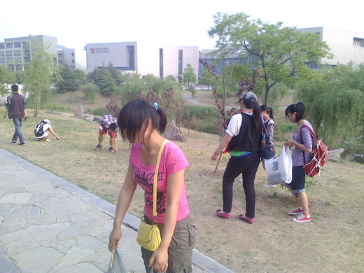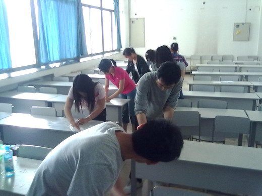 楼会合。这次活动分为两个部分——擦掉自习室桌子上的字迹和污垢;到矿大北门捡竹签和垃圾。班级同学也相应的分为了两组。