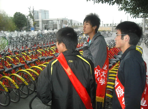 服务分队A组十余名成员在校园通借车部一区区长崔楠的带领下来到北门校园通借车处开展校园通“北车南调”活动。