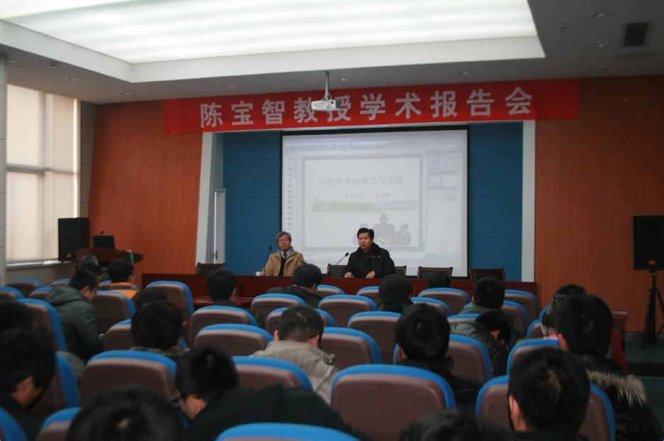 的100多名师生参加,报告厅座无虚席。详实的数据、幽默的语言、图文并茂的讲解,陈宝智教授将大家带入了系统安全的科学领域,两个多小时的学术报告博得了现场听众阵阵掌声。
