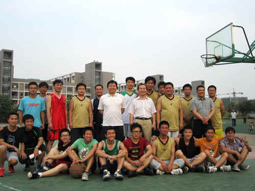 老师混合分成了两组,分别由李院长和钱书记带领。虽然艳阳高照,但高温丝毫没能阻挡老师和同学们的比赛热情。首先,中场发球,李院长所在的队伍首先拿到了球权,经过快速的转移,顺利突破上篮,率先得分。在第一节的比赛中,双方的比分咬得很紧,交替上升,但是在第二节的比赛中,李院长带领的队伍,利用自身的速度优势,连续快攻得手,将比分差距拉到了十分。下半场,经过多次的换人,钱书记所带领的队伍也不甘落后,连续打出了两个8:0的小高潮,将比分拉近。在比赛还剩最后一分钟的时候,钱书记所带队的队员一记三分球将双方的比分拉平,赢得全场的欢呼。最终双方达成了79平,比赛圆满结束。在整个比赛的过程中,章毛平书记一直在场边为场上的球员加油,给了场上的球员很大的鼓舞。