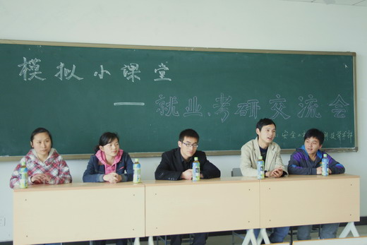 团委、学生会科技学术部主办的“模拟小课堂——就业、考研交流会”在教五C302顺利举行。本次交流会邀请到了06级的史波波、江大鹏、韩文彬、张远娇和王洁同学作为嘉宾,为大家解答就业、保研、考研方面的疑问。