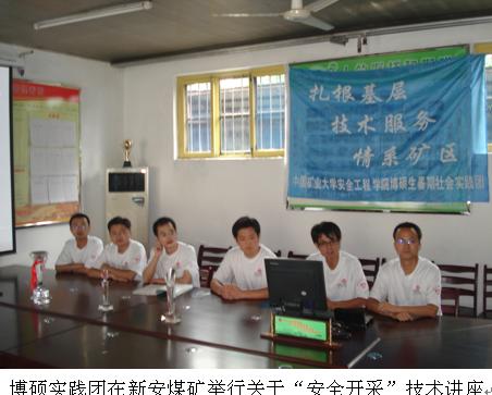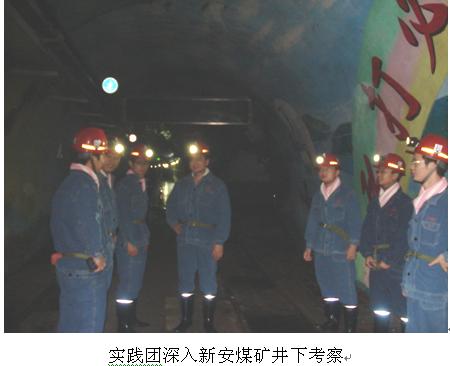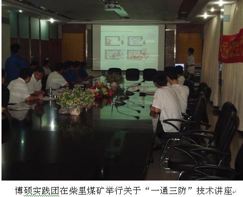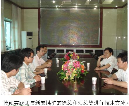 开始正式进行社会实践,在科技服务的社会实践中,实践团受到了新安煤矿、柴里煤矿和田陈煤矿的热烈欢迎。每到一个矿,大家都与煤矿生产技术负责人总工程师进行了科技技术座谈交流会;之后在每个煤矿都举行了一次关于煤矿“安全开采,一通三防”方面的技术讲座;并在技术副总的陪同下参观了一些比较有特色的加工厂如新安煤矿的洗煤厂等,同时,博硕团成员深入井下针对具体问题当场分析,同时提出在技术方面的看法。在考察过程中,煤矿相关负责人把企业的基本运行情况向实践团成员进行了简单的介绍,同时博硕团成员根据煤矿领导和技术人员提出的难题,结合自己所学专业知识同企业相关人员进行了技术服务,科技攻关等方面的讨论。