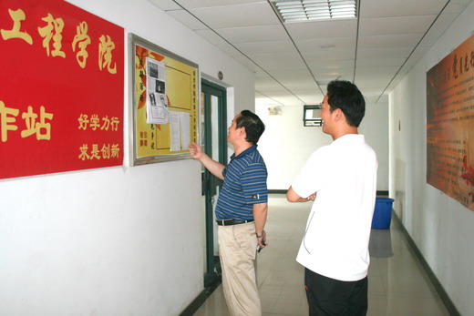 章书记、钱书记首先察看了学生公寓党员工作站公示栏,然后详细询问了党员工作站的建设情况、工作开展情况。随后他们来到梅三五楼学生党员工作站,就工作站内的设施布局、文化建设等方面与党员工作站站长徐跃进行交流。视察过程中,章书记指出学生党员工作站是重要的党员服务窗口,对于发挥党组织引导人、团结人、凝聚人的作用有着不可替代的作用。但要使工作站真正发挥预想的作用,不能仅仅停留在表面、形式上,更主要的是要将学生党员工作站的各项规章制度落到实处,使广大同学在学生党员的带领下,丰富业余生活,提高思想内涵,自觉营造积极向上的文化氛围。