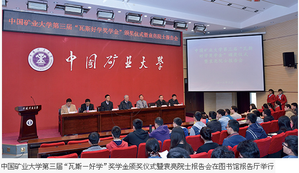 颁奖仪式结束后,袁亮院士为与会同学作了专题报告。他结合世界能源发展的历史和现状,深入浅出地分析了能源特别是煤炭产业在人类文明发展和工业革命中发挥的重要作用,并结合目前国际局势指出,在当代,能源问题不仅是经济社会问题,也是国际政治问题。他说,虽然新能源在能源结构中的比重在不断加大,但在未来几十年中,煤炭在中国的能源结构中仍将占有很大比重。在谈及中国矿业特别是煤炭工业的发展时,他重点阐述了以“安全、绿色、科技”为主题的发展模式,强调采矿要安全,采矿技术要和科技结合,以及煤炭要绿色清洁利用。报告会上,袁亮院士与同学们分享了自己从煤矿基层做起,敢于吃苦,不断钻研,将个人理想与行业需求和国家发展紧密结合,最终成为中国工程院院士,并为中国煤炭工业科技进步作出贡献的人生经历。他在报告中特别提到,1982年大学毕业后在淮南矿区多年的一线工作经历,不仅让自己意识到了书本理论和实践存在的差距,更认识到了创新思维的极端重要性。他说,人的一生最宝贵的是在三四十岁以前,精力旺盛,能够不断吸收新知识,敢于尝试和创新。在谈及自己后来的学术研究时,袁亮院士说,正是因为自己不断潜心钻研各地高瓦斯条件矿区情况,将理论与实践相结合,心系国家煤矿安全现状,才能不断攻克技术难关,创新开采方式,提高安全性能,与一大批专家共同开创的中国煤炭开采技术得到了世界的认可。