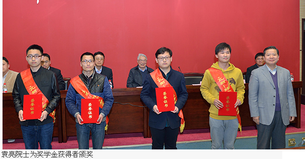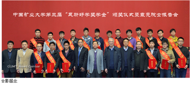 “瓦斯-好学”奖学金是由中国工程院院士袁亮捐资设立,周世宁院士和袁亮院士担任指导委员会名誉主任,校长葛世荣担任指导委员会主任并纳入学校管理的一种专项奖学金。本届“瓦斯-好学”奖学金经过学生申请、评选委员会评选以及公示等程序,共有11名同学获得学业成绩优秀奖学金,9名同学获得学术创新成果突出奖学金。周世宁院士、袁亮院士,曹德欣副书记分别为“学术创新奖学金”获得者和“学业优秀奖学金”获得者颁奖。