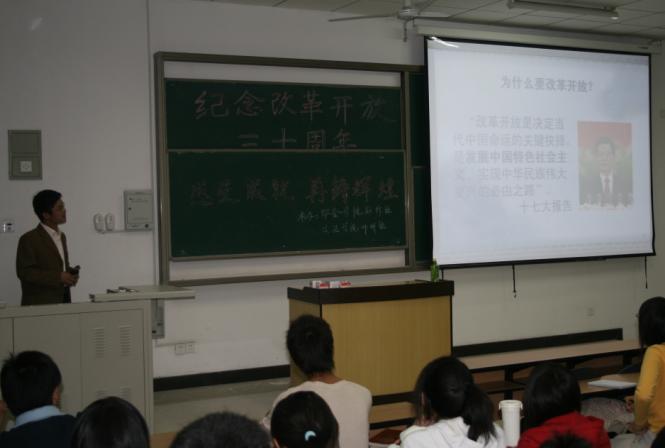 晚上7:00讲座在同学们热烈的掌声中正式开始。聂老师首先引用了胡锦涛总书记在十七大报告中的讲话,具体阐述了中国当时改革开放的背景及意义。接下来,聂老师又从三个方面系统地阐述了自己对改革开放的理解:跳出曾经选择的苏联发展模式的束缚;总结经验,特别是发展过程中得到的教训;开创有中国特色的社会主义现代化发展道路。