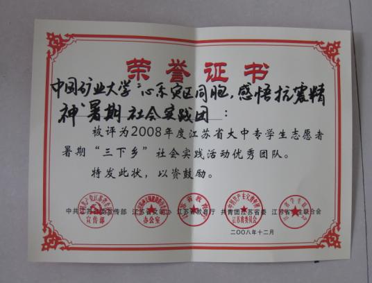 “‘心系灾区同胞,感悟抗震精神’暑期社会实践团” 社会实践服务团队荣获“江苏省大中专学生志愿者暑期‘三下乡’社会实践活动优秀团队”称号。