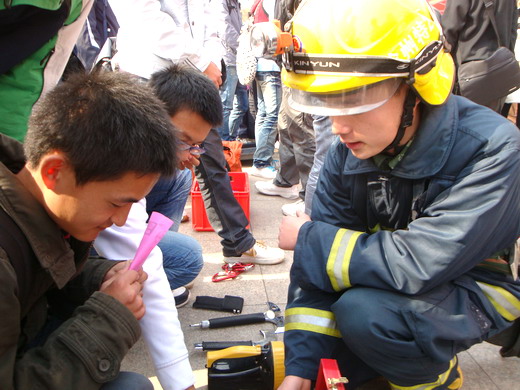 消防特勤二中队的战士们各个都装配整齐。当他们将各种消防设备陈列出来时,引起了同学们极大的兴趣。面对同学们的好奇和疑问,消防战士们耐心细致地进行了讲解。同时对救生、破拆、侦检、堵漏、输转等方面的消防设备进行了详尽的介绍,并协助同学们亲身体验了消防设备的佩戴和使用,活动现场气氛十分活跃。章毛平书记在活动现场亲切地与消防官兵交谈,并与同学们就校园安全与消防知识进行沟通。活动期间青协成员为过往的同学们分发了校园防火自救知识的传单,积极的宣传消防知识。