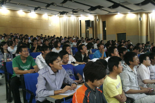 知行社社长贾伟同学的主持下正式开始,本次活动分为风采展示、观众提问以及嘉宾总结三个环节。十五个先进团支部代表按照抽签次序依次上台展示,他们以PPT、电子杂志、视频图像等资料为载体,向现场的老师及同学展示出各自团支部建设的方法及丰 硕成果。他们分别介绍了团支部在思想建设、学风建设、特色工作等各方面取得的成果及经验,精彩的展示赢得了现场观众的阵阵掌声。现场气氛异常热烈,走上镜湖大讲堂的各个团支部也备受鼓舞。其中,机自08-10班团支部提出的“班级荣誉至上”的理念、德语07-1班团支部介绍的“我们如此优秀——说出同学的优点”活动、信安07-1班团支部介绍的“三年后的我”主题班会、地质08-3班团支部介绍的评选“班级学习标兵、卫生标兵”活动等给现场的老师和观众留下了深刻印象,同时也为团支部建设提供了宝贵的经验。